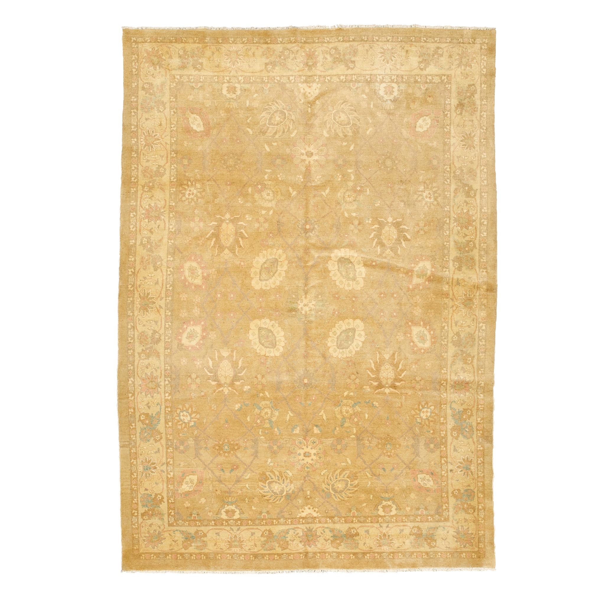 the light brown field with allover palmette and foliate lattice pattern, within lighter brown border