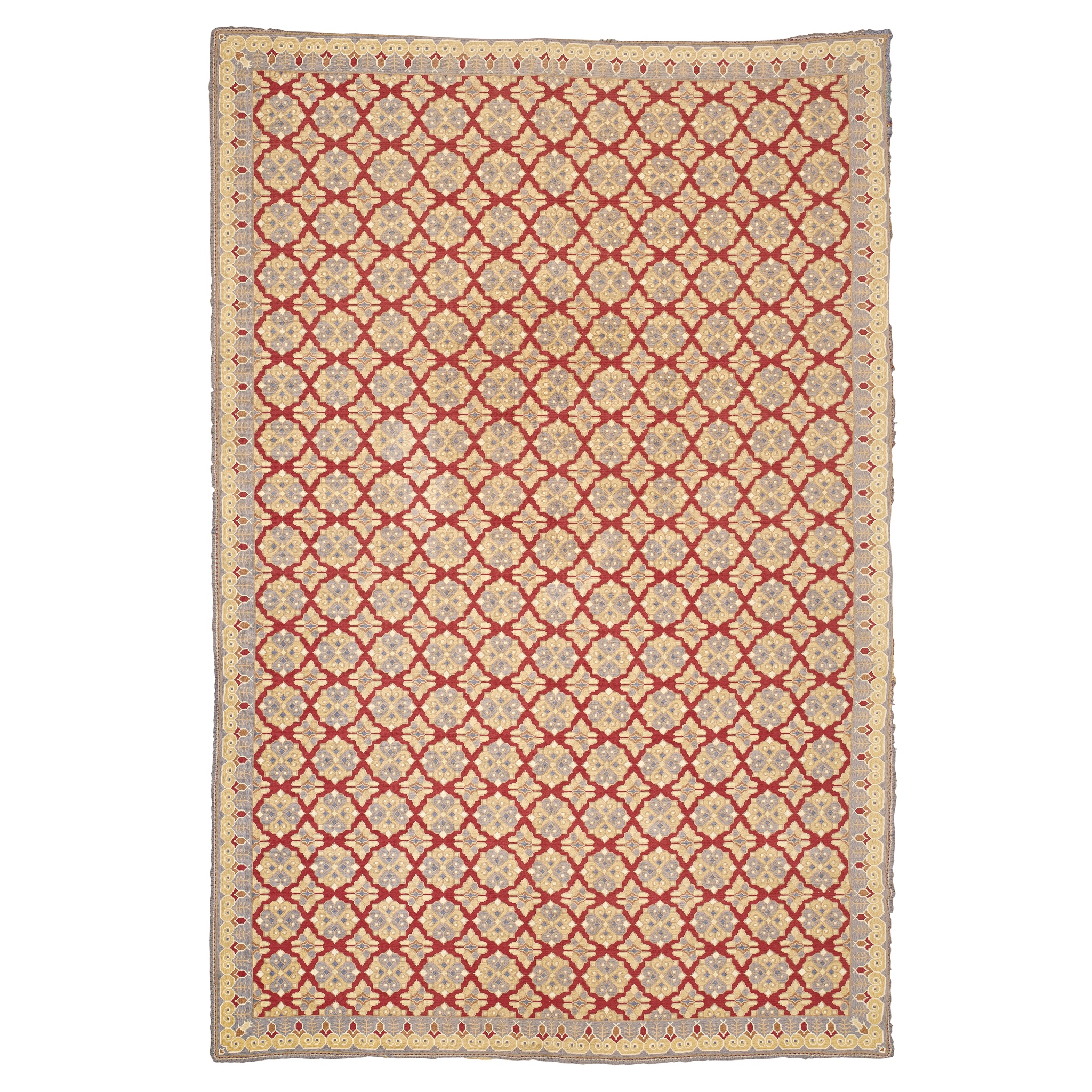 the red field with allover rosette pattern, within grey border
