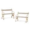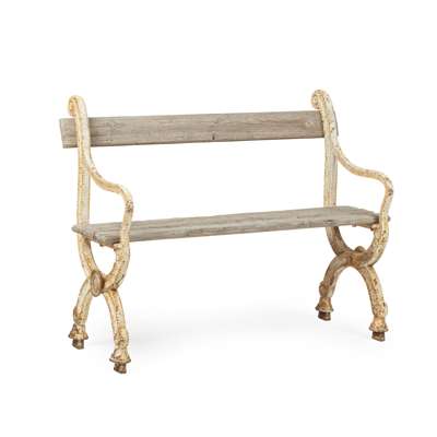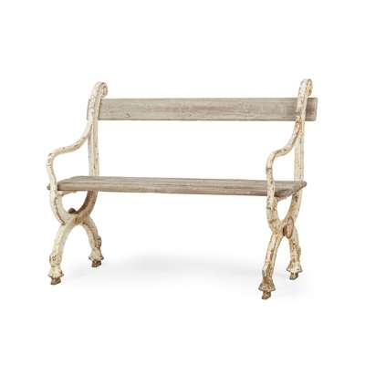 with scrolling arms and cerule bases, joined by wood slat seats and back rests (2)