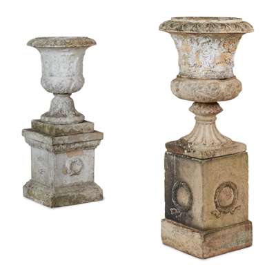 both with egg-and-dart everted rims above leaf moulded bodies, on square pedestal bases with laurel wreaths (2)