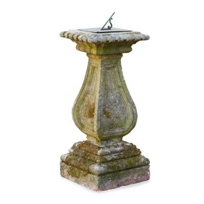 the bronze top with engraved scale, ‘Sunny Hours’ and with a scroll gnomon, on a square plinth base with waisted pedestal