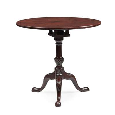 the circular tilt top on a birdcage support and spiral carved baluster column, on acanthus carved cabriole legs ending in pointed pad feet