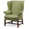 the tall square back and serpentine wings above a loose cushion seat flanked by scrolled arms, raised on square legs joined by an H stretcher; in green patterned upholstery