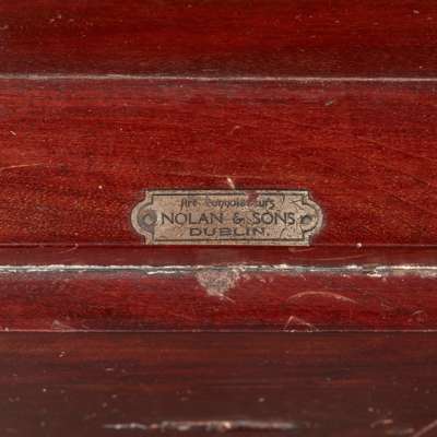 of cubic form, the hinged lid and front with oval satinwood inlay, with brass bail handles to the sides, raised on square tapering legs, bearing old trade label ‘Nolan & Sons, Dublin’