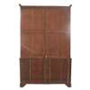 the lancet moulded cornice over a pair of astragal glazed doors opening to a fabric-lined interior with adjustable shelves, above five short drawers; the associated base with two pairs of moulded cupboard doors opening to sliding trays, on bracket feet