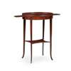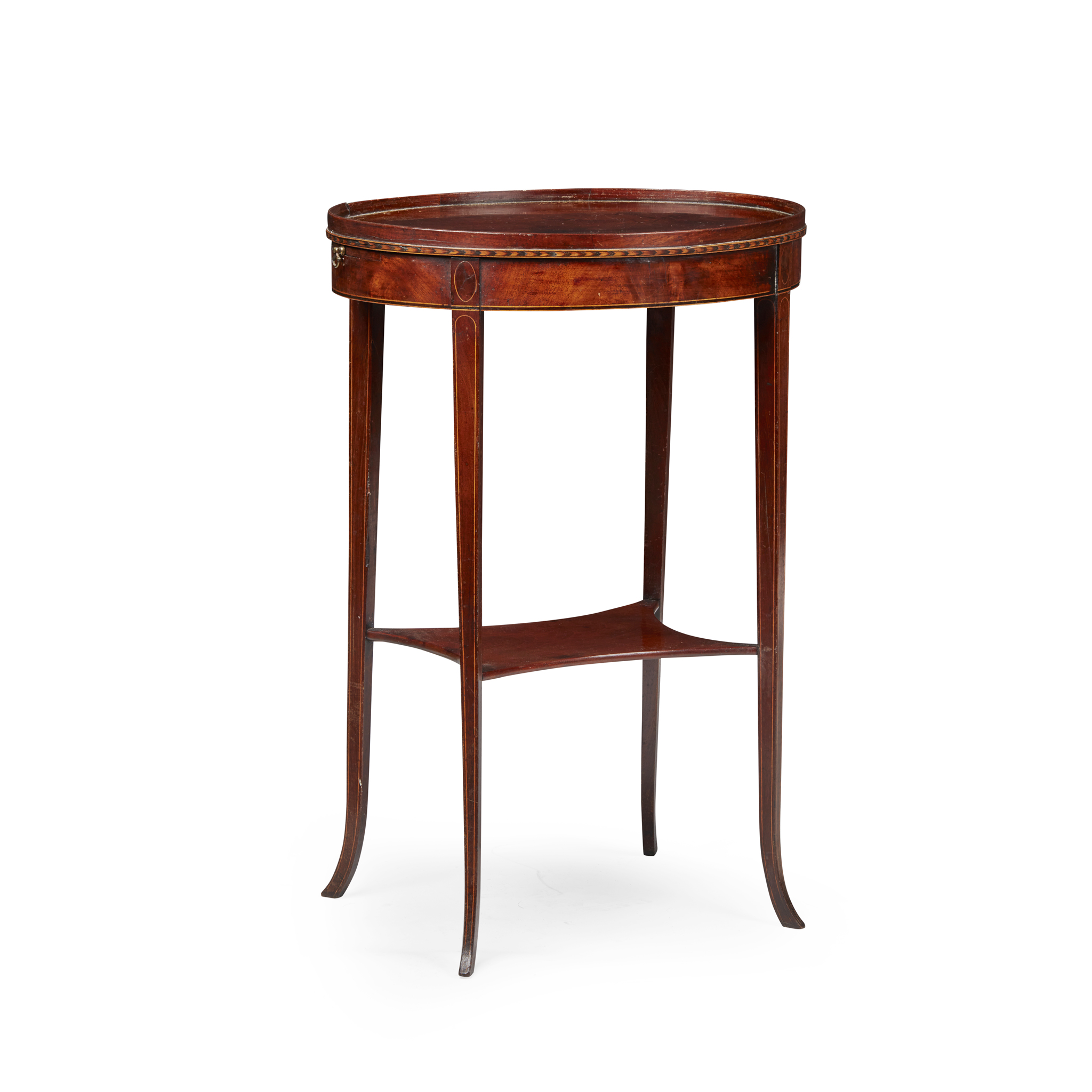 the oval tray top above a feather banded frieze with candle slides to the sides, raised on slender square tapering legs outlined with stringing and joined by a concave undertier