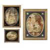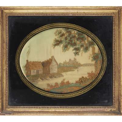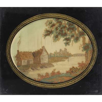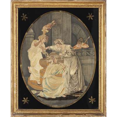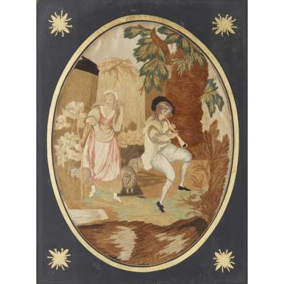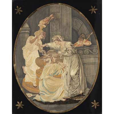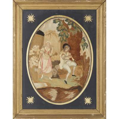 all oval and worked in silk with various stitches on silk grounds, the first depicting a young man playing a pipe while a young lady looks on, 40cm x 29 [sight size]; the second with three young maidens laying floral tributes on an urn while a Roman soldier looks on, in an eglomise mount, 35cm x 27cm, [sight size]; and a small scene of a cottage by a river, in an eglomise mount, 14cm x 18cm [sight size]; in gilt frames (3)
