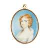 oval, watercolour and gouache on ivory, the sitter with auburn hair in tight ringlets, wearing a white chemise with lace edged open neckline outlined with pearls and a pink sash, in a gilt metal frame with suspension loop