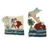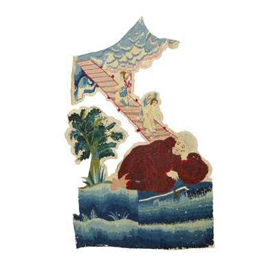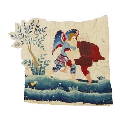 wool embroidery on linen, the first fragment depicting the sleeping Jacob dreaming of a ladder set up on the Earth, the top of it reaches to heaven with angles ascending and descending, the second with the angel Sariel sent by the Lord to Jacob, both set within flowing vegetation (2)