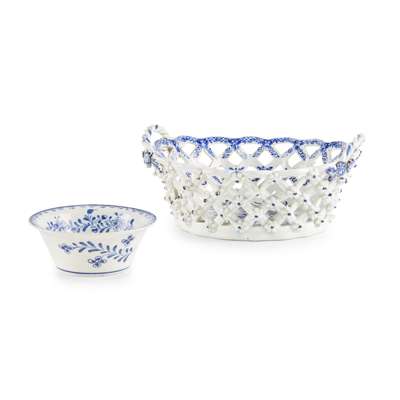 the pierced basket with entwined twin handles, the exterior applied with flowerheads in the intersections, printed to the interior with the ‘Pine Cone’ pattern, unmarked, 19cm wide; the patty pan painted to the interior with a moth or butterfly with stems issuing flowers to the inside and outside of the pan, unmarked (2)