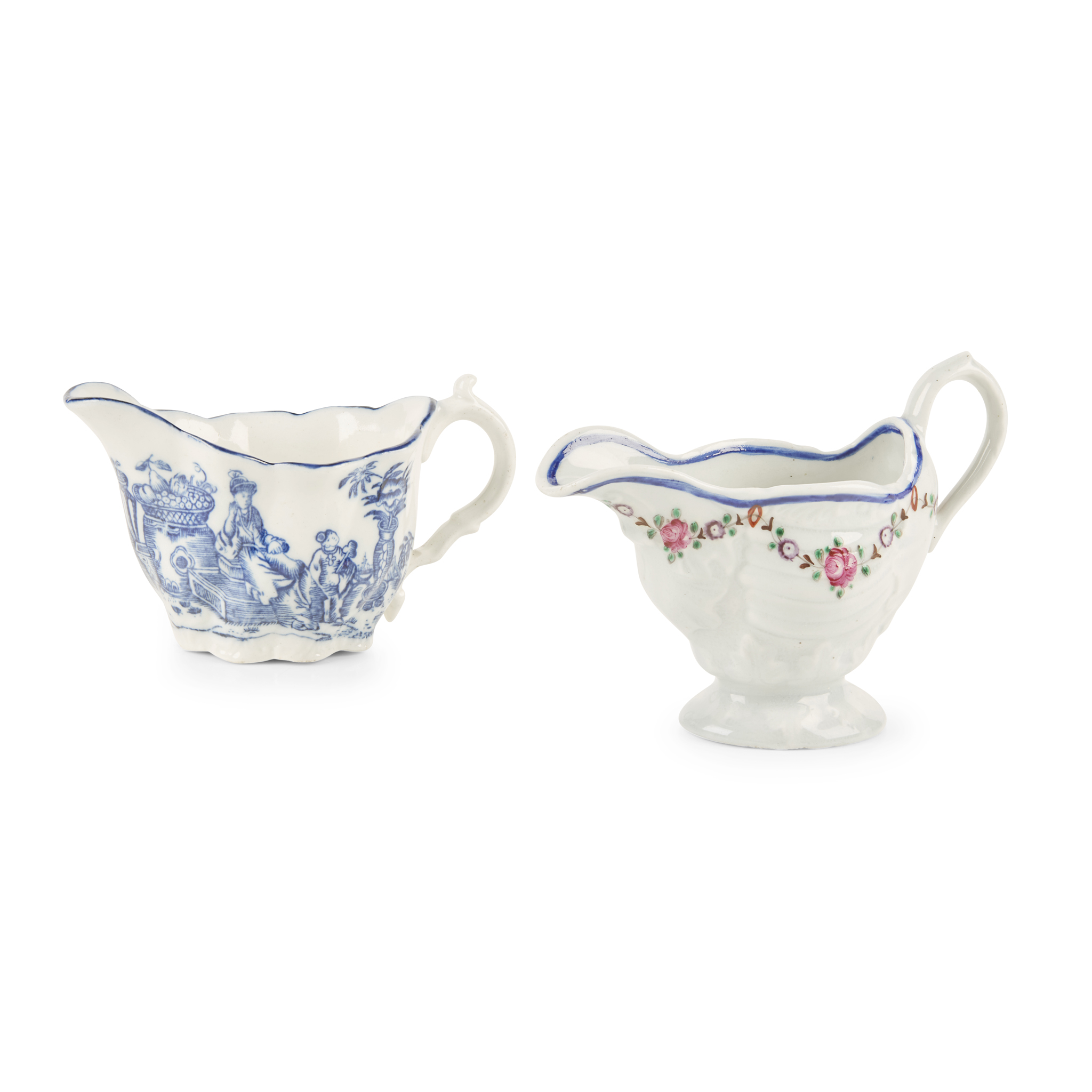 the dolphin ewer with shell moulding and a band of acanthus leaves around the foot, polychrome painted with a floral garland suspended from red loops, with a blue line rim, unmarked; the Caughley ewer of wrythen fluted form, printed in blue with chinoiserie figural decoration and urns issuing flowers, underglaze SO mark (2)