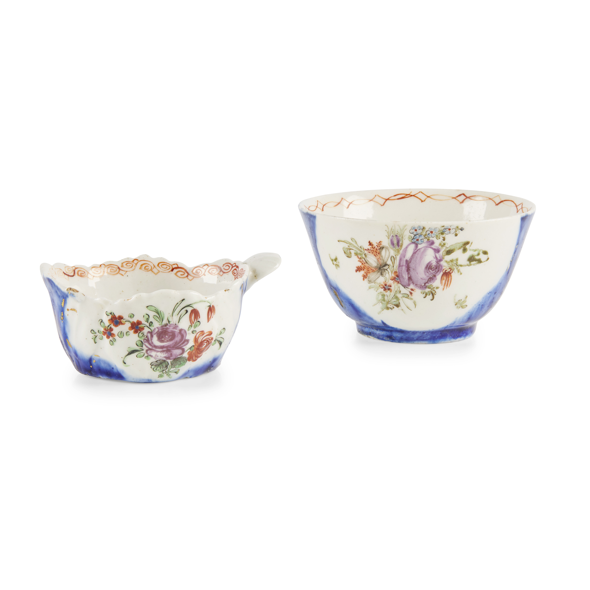 the teabowl polychrome painted with a panel of mixed flowers to one side, and a butterfly to the reverse, on a mazarin blue ground, unmarked; the butter boat of leaf moulded form with similar decoration, unmarked (2)