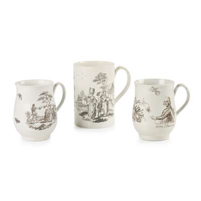 one of baluster form, printed with ‘The Minuet’ and ‘The Garland Makers’, unmarked; one of cylindrical form, printed with ‘Milkmaids’ and ‘May Day’, unmarked; and a commemorative baluster shaped mug printed with The King of Prussia and trophies, unmarked