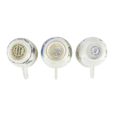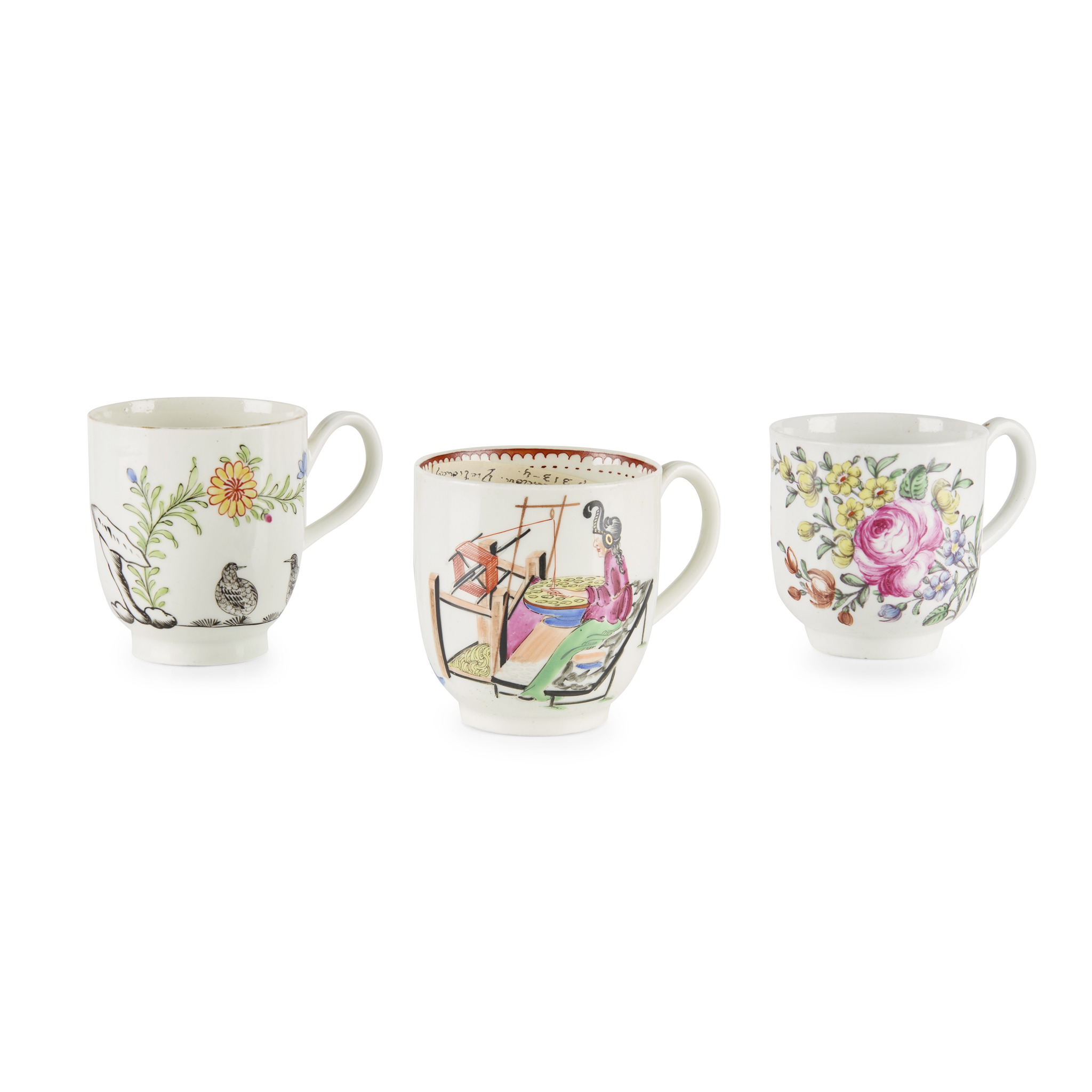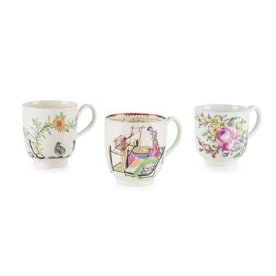 one densely painted with flowers, unmarked, Albert Amor label; a cup painted with the ‘Spinning Maiden’ pattern, unmarked, Watney Collection label; and a cup painted with the ‘Two Quail’ pattern, unmarked, Girton 2004 Exhibition label (3)