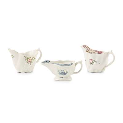 TWO ENGLISH PORCELAIN 'CHELSEA' EWERS AND A LOWESTOFT CREAM EWER