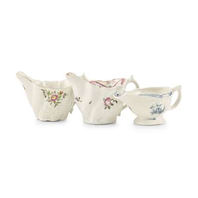 comprising a Coalport ewer, the body with moulded acanthus leaves, painted to the exterior with small floral sprays and to the interior rim with diaper and swag puce decoration and an ochre rim, unmarked; a Worcester ewer, with acanthus moulding and painted with simple flowers and sprays, unmarked; the Lowestoft cream ewer decorated in underglaze blue with ‘Little Fishermen’ in reserves, with a cross hatched border and flower to the interior, unmarked (3)