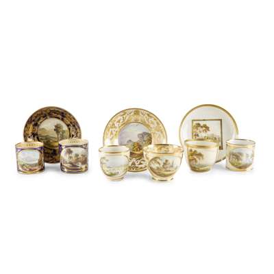 comprising a cylindrical coffee cup and saucer painted with ‘In Italy’ and ‘L?y Gwymont’, probably painted by John Brewer; a cup and saucer with cup entitled ‘Near Leicester’, saucer titled ‘Near Kirkcudbright, Scotland'; a cup and saucer, both entitled ‘In Scotland’; two coffee cans, one entitled ‘Near Verona, Italy’, the other ‘Near Kirkcudbright'; and a cup inscribed to the base ‘Matlock Bridge, Derbyshire’, various painted factory marks (9)
