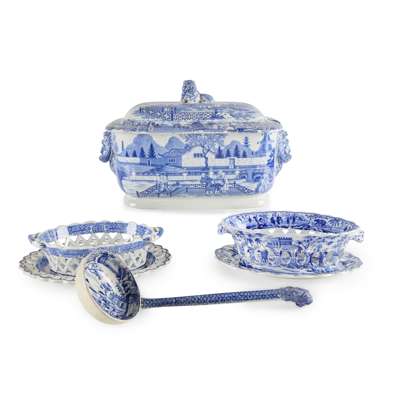 printed with the ‘Chinese Market Stall’ pattern, with twin lion mask handles, the domed cover surmounted with a lion finial, unmarked, 23cm wide; with a ladle in the same pattern with a lion mask terminal, 30cm long; together with TWO SPODE PEARLWARE PIERCED BASKETS ON STANDS, one from the Caramanian series, printed with ‘Sarcophagi at Cacamo’, impressed SPODE; the other printed with ‘Forest Landscape', stand impressed SPODE (6)