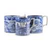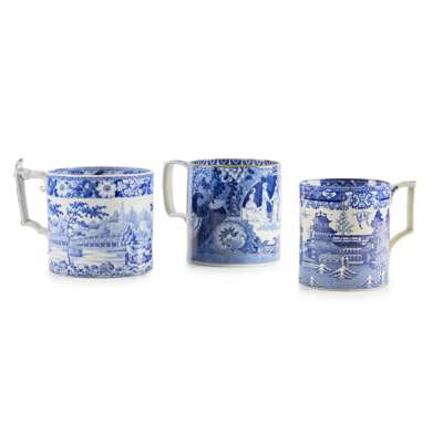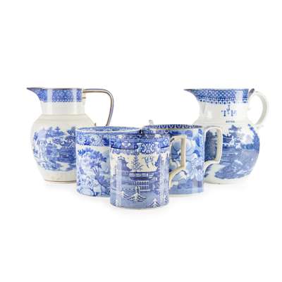 THREE LARGE TRANSFER PRINTED BLUE AND WHITE MUGS, A PEARLWARE ARMORIAL JUG AND PEARLWARE JUG DATED 1792