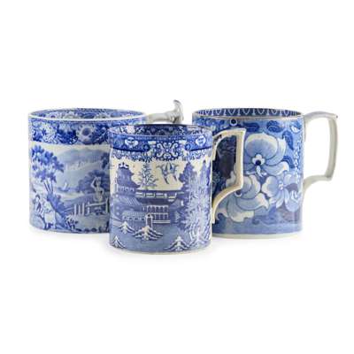 one mug printed with a figural scene within an oval, the ground with large flowers, unmarked; one printed with a cottage and ferryboat, unmarked; one by Stevenson with chinoiserie designs; the armorial jug printed with chinoiserie designs and overglaze enamelled below the spout with a crest and the initials RJ, target mark; the dated jug printed with chinoiserie designs and inscribed with the initials J T M, over the date 1792, unmarked (5)