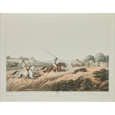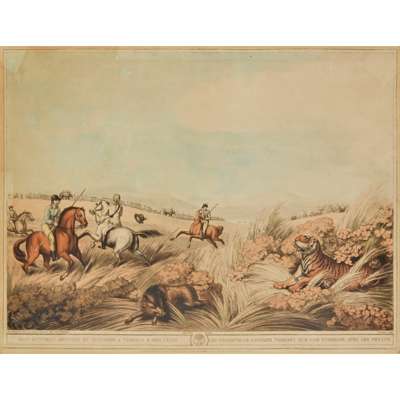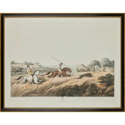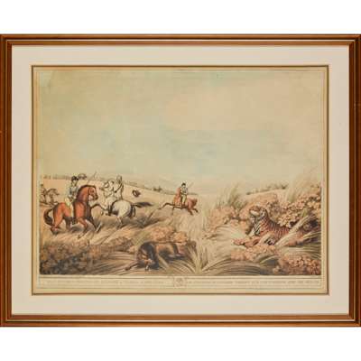 one tureen printed with ‘Hog-Hunters Meeting by Surprise a Tigress & Her Cubs', printed title, printed and impressed marks, 24cm wide, with a framed Sam Howett & Thos Williamson print of origin entitled ‘The Chase After A Hog’; the rectangular tureen printed with ’Hunting a Buffalo', printed title, printed and impressed marks, 25cm wide; the tureen printed with ‘The Hog at Bay’, no cover, printed and impressed marks, 37.5cm wide (5)