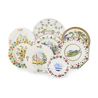 comprising six plates, including an octagonal fish painted example by R & G Gordon, Prestongrange, and another fish plate by Gordon; one by Murray & Co, Glasgow, printed to the centre with a rural scene; a William Reid, Musselburgh floral painted plate and another by Reid depicting houses and trees; a Verreville small plate printed in blue with a boat scene; a plate enamelled in orange, brown and green with an impressed crown mark; the Greenock plaque in prattware colours, moulded with a classical scene of Bacchus seated beside a lion, Ceres holding a cornucopia and Venus embracing Cupid (8)