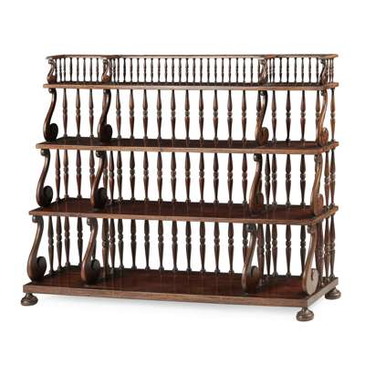 the spindle galleried top over four graduated shelves with scrolled supports, raised on bun feet