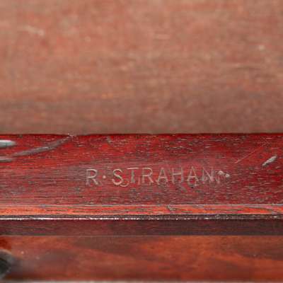 REGENCY STYLE MAHOGANY, EBONISED, AND BRASS MOUNTED WRITING TABLE, BY R. STRAHAN, DUBLIN