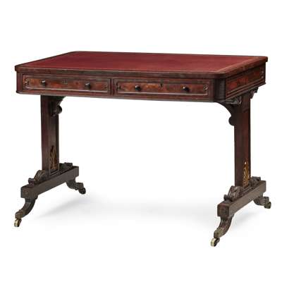 the rounded rectangular top with a wine-red leather insert with gilt tooled border, above a pair of short frieze drawers with dummy drawers opposing, raised on tapered end supports with brass anthemion mounts and platform trestle bases with reeded sabre legs ending in foliate cast brass caps and castors, stamped in the drawers