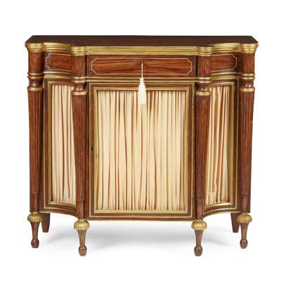 the shaped breakfront top with a reeded gilt edge above a central frieze drawer and cupboard door lined with pleated peach coloured silk, flanked by matching concave side panels flanked and divided by fluted tapering corner pilasters ending in part-lobed parcel gilt tapered feet