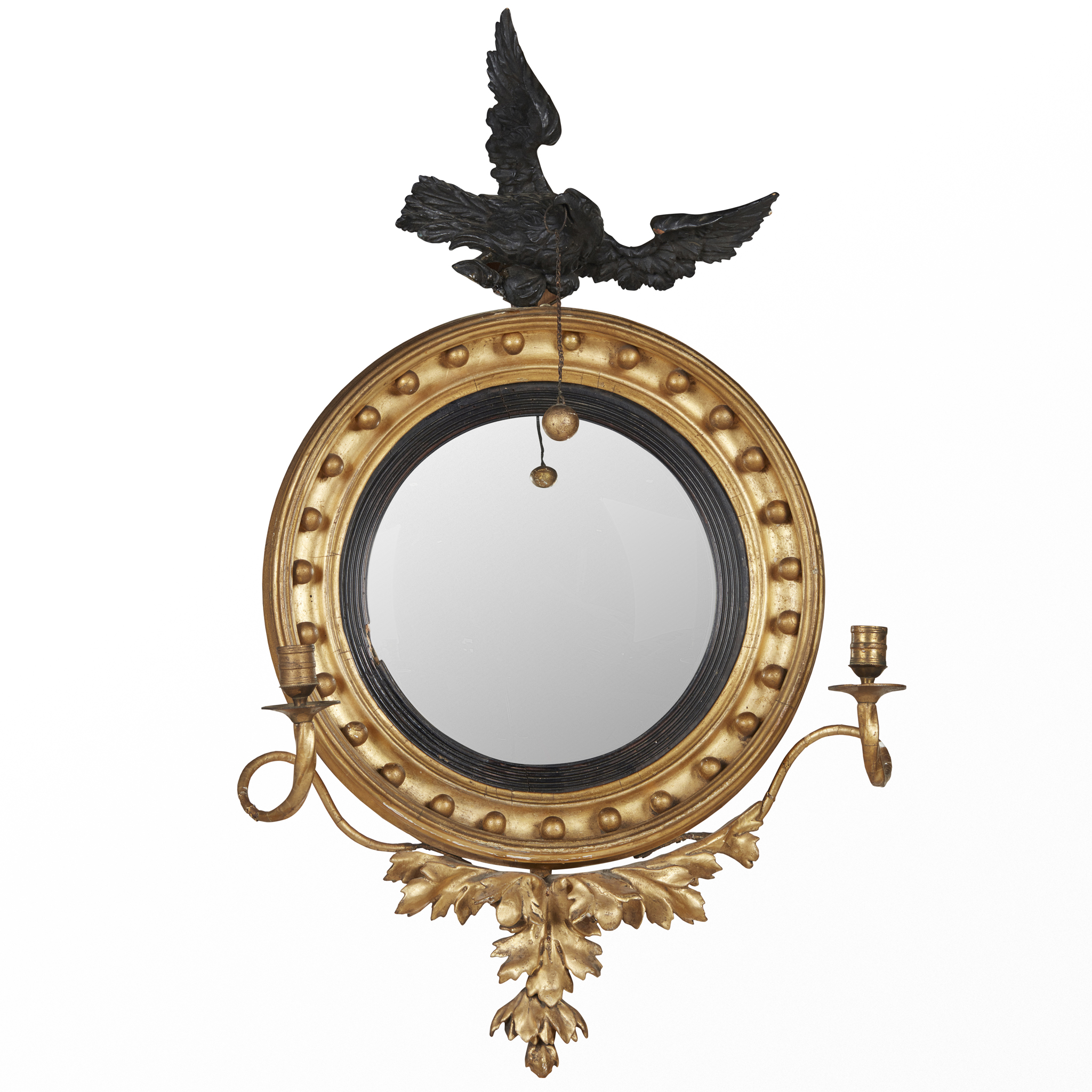 SMALL REGENCY GILTWOOD AND EBONISED CONVEX GIRONDOLE MIRROR