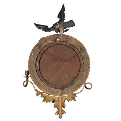 the circular mirror plate in a moulded frame with ball mounts and surmounted by a carved ebonised eagle, and issuing two scrolled candle arms