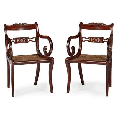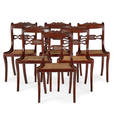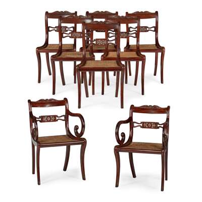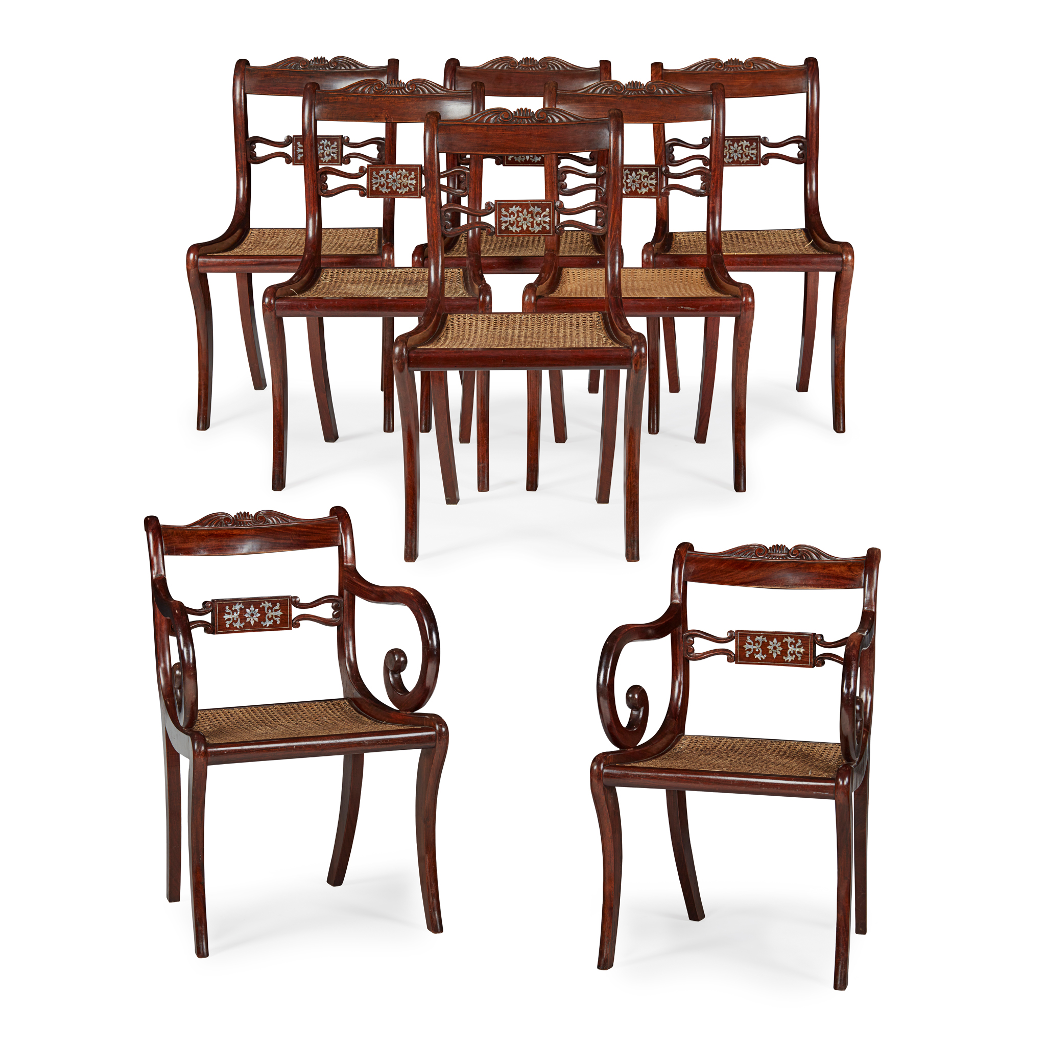 SET OF EIGHT REGENCY MAHOGANY AND MOTHER-OF-PEARL INLAID DINING CHAIRS