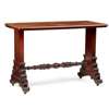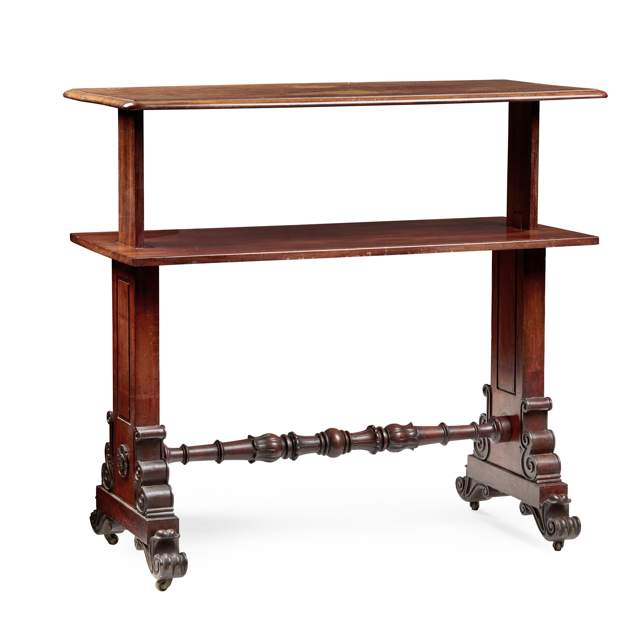 with a rising tier with moulded edge above another similar, on tapering end supports with scroll carved trestle bases joined by a lotus carved stretcher, on scroll feet with brass castors