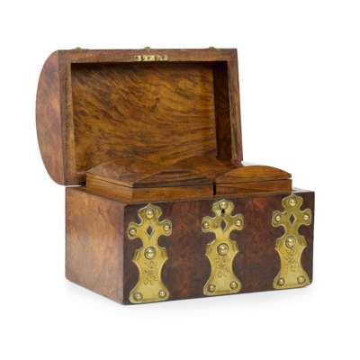 EARLY VICTORIAN BURR WALNUT AND BRASS STRAPWORK TEA CADDY