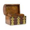 of domed sarcophagus form with three rows of brass strapwork engraved with floral sprays, the fitted interior with two domed foil lined caddies
