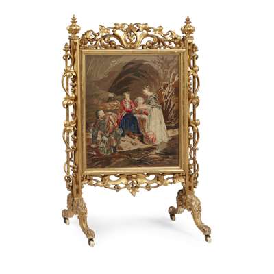 VICTORIAN GILTWOOD, GESSO AND NEEDLEWORK FIRESCREEN