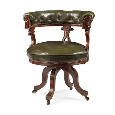 the U-shaped top rail upholstered in buttoned green leather, raised on C scroll supports above a swivel action circular padded seat in matching leather with close nail trim, raised on square cabriole legs ending in ceramic castors