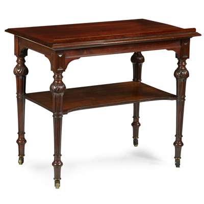 the hinged and ratchet adjustable rectangular top with a moulded edge and book rail, above bead moulded frieze with quarter brackets, raised on ring-turned fluted legs joined by a shaped undertier and ending on brass castors
