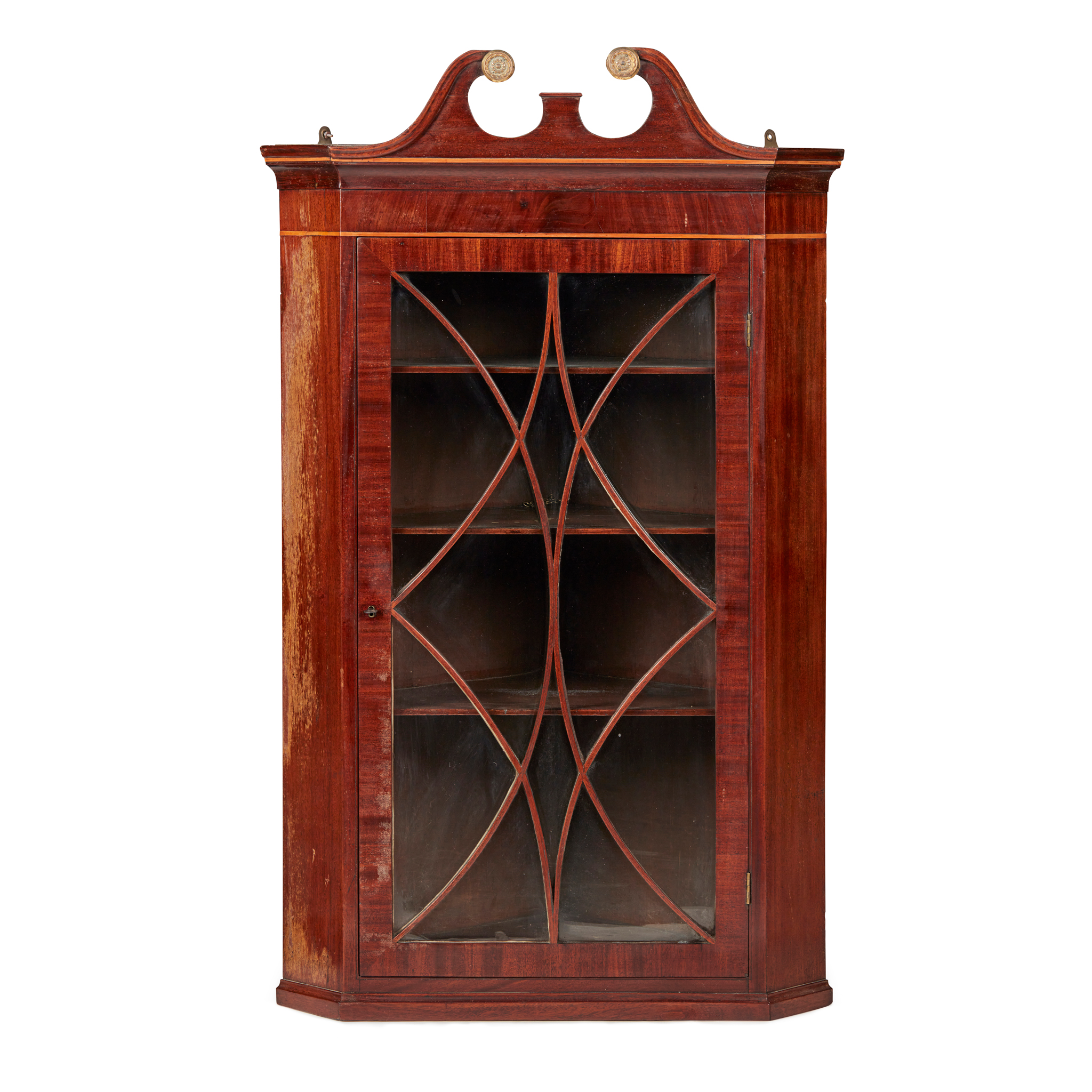 the broken arch pediment above a pair of astragal glazed doors enclosing shelves, all outlined with stringing