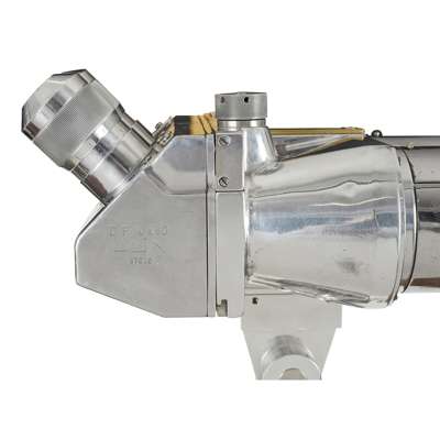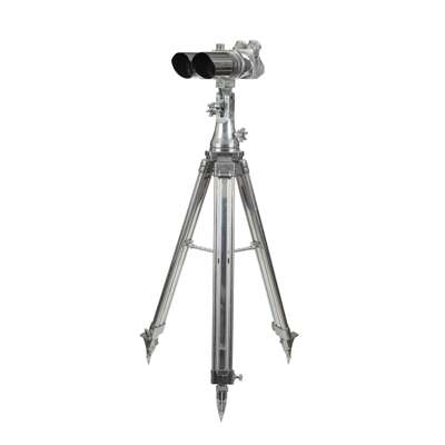 likely by Jos Schneider & Co, Kreuznach, Germany, in polished steel and aluminium, with ribbed adjustable lens housings and a horizontal adjusting knob, the right side stamped ‘D.F.10X80’, with maker's code ‘△ dkl X’ and numbered 67090, detachable anti-flare hoods, on an aluminium cantilever bracket, all mounted on a later aluminium tripod with folding stretchers and mounts