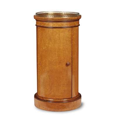 the circular top with a pierced brass gallery, above a cylindrical body with a door enclosing a shelved interior, on a plinth base