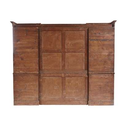 the moulded cornice over four astragal glazed doors opening to shelves, the lower section with four panel doors, on a plinth base