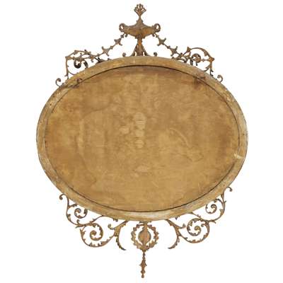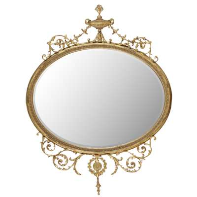 the oval bevelled mirror plate within an egg-and-dart moulded frame, surmounted by an urn with an anthemion finial and hung with foliate scrolls and trails