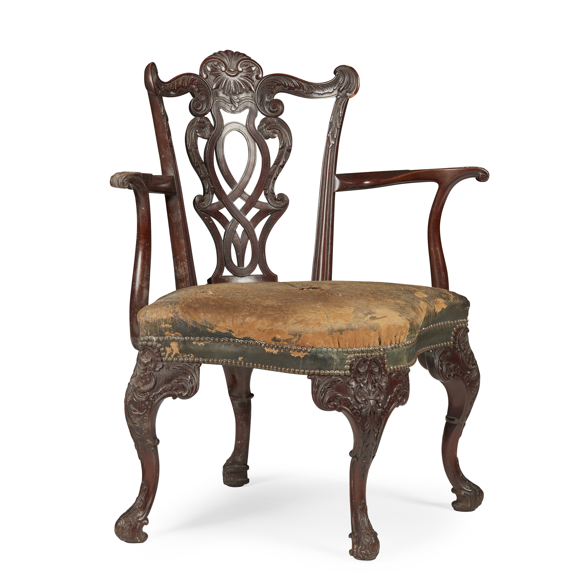 of large proportions, the curved serpentine toprail and pierced splat over leather upholstered seat between scrolled open arms, raised on foliate and scroll carved cabriole legs