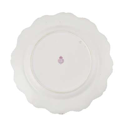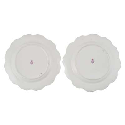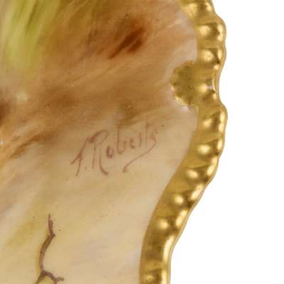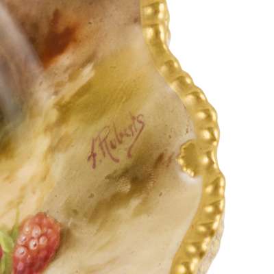 one painted with apples and grapes on a mossy ground, the other painted with plums and raspberries on a mossy ground, each with a gadrooned scalloped rim, both signed F. Roberts, puce factory marks (2)