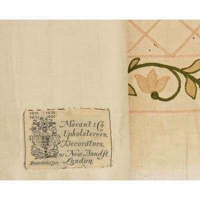 fine wool embroidery on linen, worked with a continual panel of fruiting and flowering trees on a trellis ground, enclosed by a meandering floral border, edged on three sides with multicoloured passementerie, with stitched label to the back ‘Morant & Co, Upholsterers, Decorators, 91 New Bond St, London’