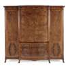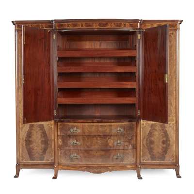 of serpentine breakfront outline, the moulded cornice above a pair of doors with strapwork and foliate inlay opening to sliding trays, above three long drawers, flanked by long cupboards with hanging space, a base drawer, and mirror-back doors, above a shaped apron raised on short legs ending in stylised pointed pad feet