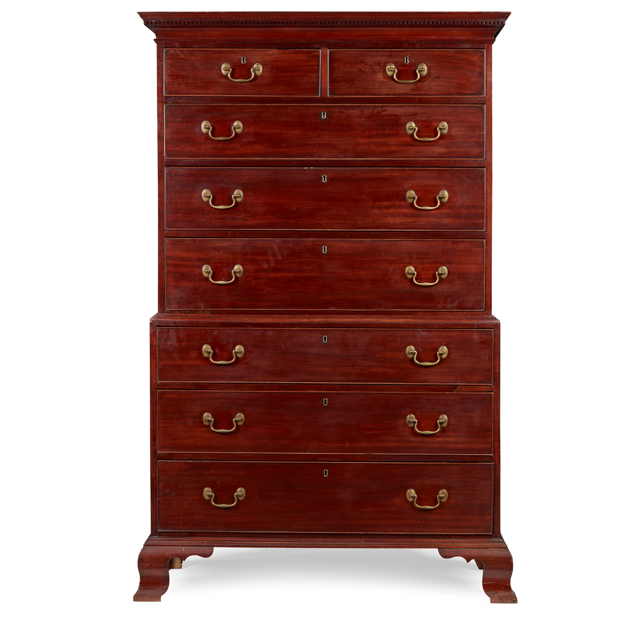 the projecting dentil moulded cornice over two short and three long graduated drawers; the lower part with three further long graduated drawers, raised on ogee bracket feet