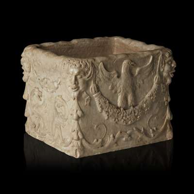 rectangular high sided form, the exterior carved with grotesque masks, eagles, foliate scrolls, a drainage hole to one side